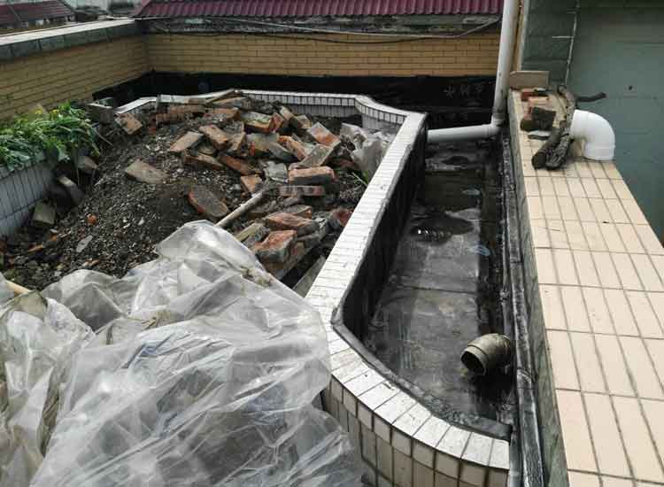 楼顶花园排水沟防水施工,这是九十年代的老房子,砖混结构,顶楼为7楼,没有电梯,顶楼复式花园户型,楼顶经业主改成成花园,有时候也种些小菜。沿墙面四周有做排水沟,以前也做过防水,由于雨水冲刷花园泥土,有些排水口有堵塞,加之防水层老化,现已出现多处漏水,领业主苦不堪言。