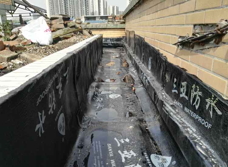 施工前,先将四周排水沟打掉,在铲泥土的时候,发现在最开始建花园的时候泥土下面铺设了一层煤渣,这主要是防止种植植物的时候植物根茎一直往下生长刺破防水层,能看出之前的施工人员也是很用心的。我们在以前基础上扩大了排水沟的宽度,以便增加排水量,还可以在以后排水沟堵塞的时候方便清理。然后找平层,用水清洗干净,等待风干后开始防水施工。我们使用的是火烤型防水卷材,5MM厚度的,